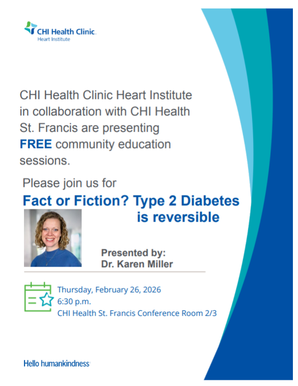 CHI Health Clinic Heart Institute in collaboration with CHI Health St. Francis are presenting FREE community education sessions. Please join us for Fact or Fiction? Type 2 Diabetes is reversible.